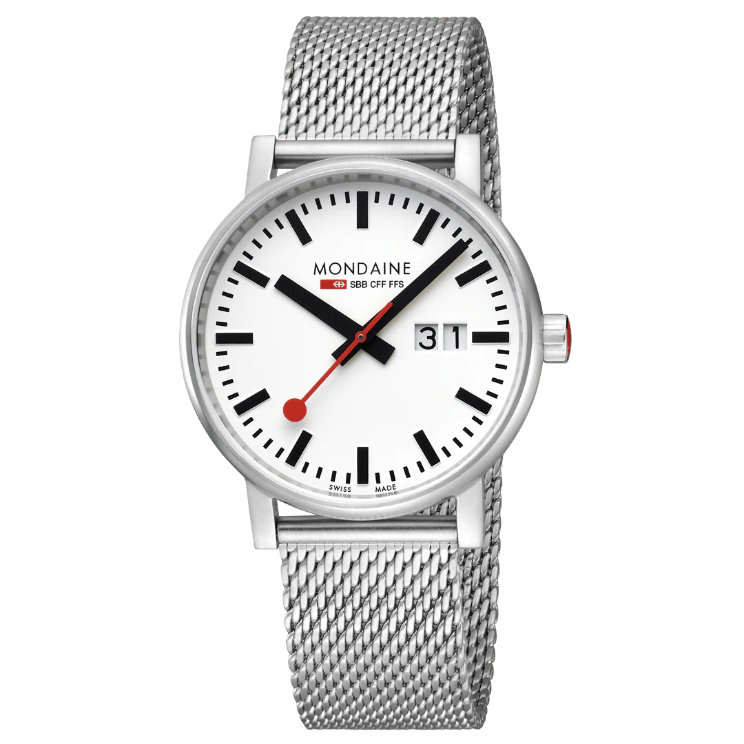 The Mondaine Official Swiss Railways Evo2 has been subtly refined for contemporary life. Its slightly rounded shape with an almost seamless transition to its case back has been ergonomically designed for ultimate comfort. The Evo2 features refined case lugs and a new functional crown. The scratch resistant sapphire crystal ensures the new model hosts the highest technical and aesthetic quality.